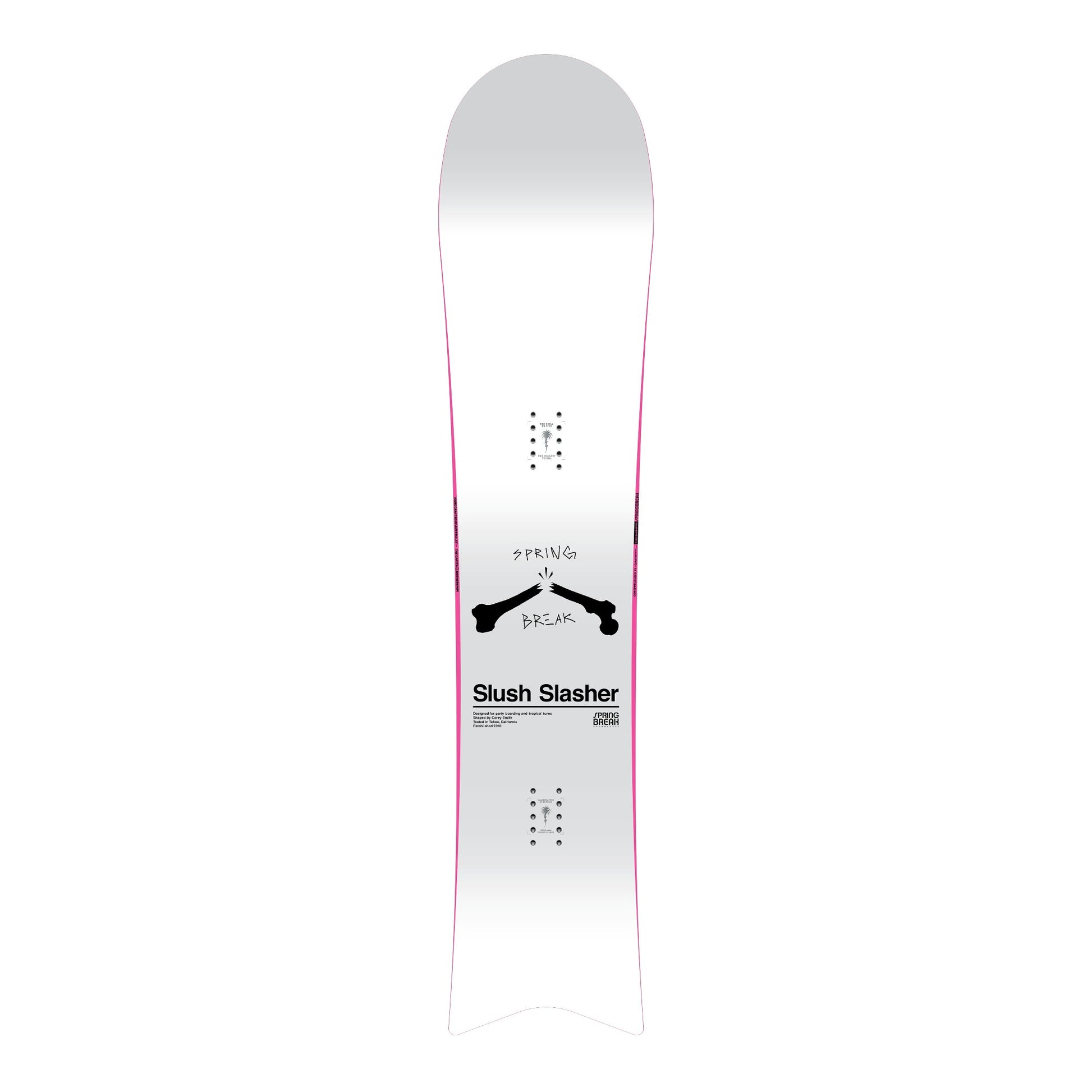 The Slush Slasher is the playful mini-park and powder ripper that changed the game. This innovative short-board rails turns on groomers, transitions, and in the park, and it’s as fun on jibs as it is in the deep stuff. This board is sure to change your perspective on any terrain and put a smile on even the grumpiest skeptics. The elongated nose plows over anything in its path, while its Vacation Tail lets you put these snow sharks on cruise control. With the Slush Slasher, the world is your seven-day weekend.
